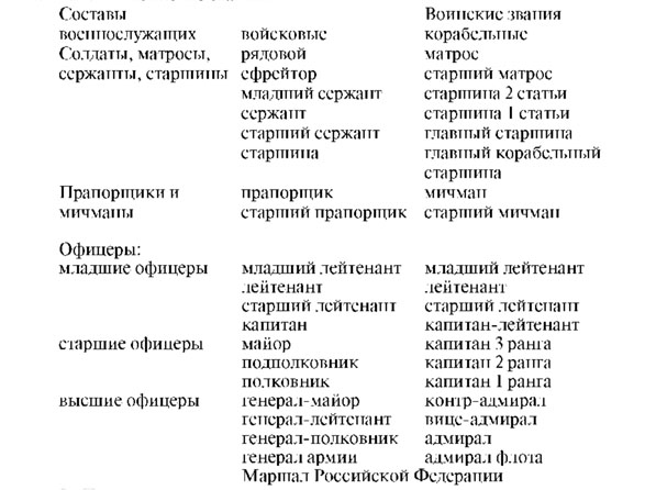 Статья 46. Составы военнослужащих и воинские звания 1. В Вооруженных Силах Российской Федерации, других войсках, воинских формированиях и органах устанавливаются следующие составы военнослужащих и воинские звания: