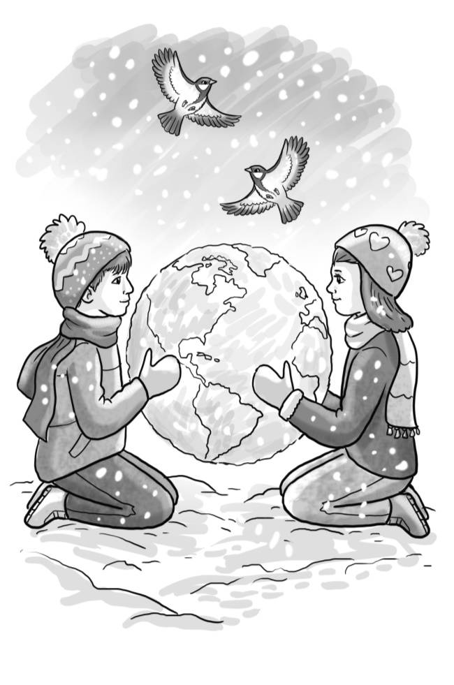 Мы из снега шар слепили,Не простой шар, а земной,Чтобы люди в мире жилиНа планете голубой.Посмотри скорей вокруг:Рядом мы с тобою, друг,Так давай беречь сильнееНа Земле творенье рук.Помогать тем, кто в соседстве,Рядом мы живём с тобой,Мы с тобой знакомы с детства,Любим мир и шар земной.Кто-то сад весной посадит,Кто-то в поле сеет лён,Кто-то Землю охраняет,Низкий им от нас поклон!Берегите, люди, Землю,Лес, озёра, птиц, зверей,Не забудьте то, что вскореНашим детям жить на ней!!!