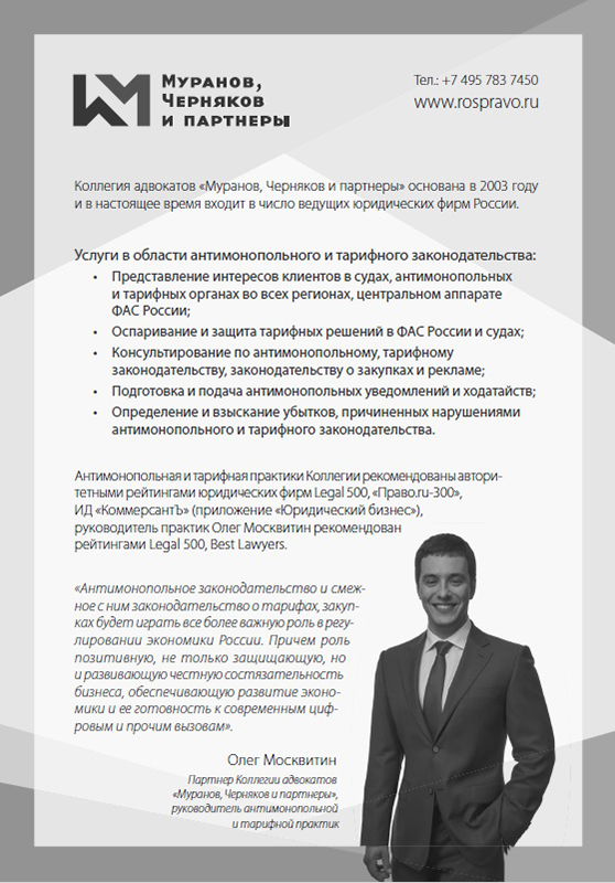 Москвитин О. А., член Генерального совета Ассоциации антимонопольных экспертов, партнер, руководитель антимонопольной и тарифной практик КА «Муранов, Черняков и партнеры»;