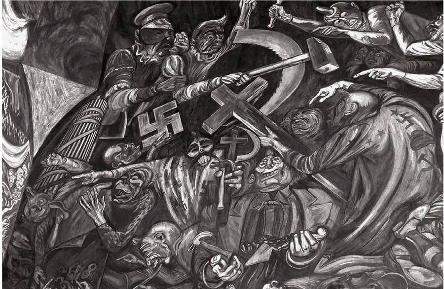 Именно в этот момент Ороско заканчивает фрески в госпитале Кабаньяс, а «Александр Невский» изымается из советского кинопроката вследствие пакта Молотова – Риббентропа, заключенного 24 августа 1939 года. В каком-то смысле Ороско предвосхитил советско-фашистский пакт о ненападении двумя годами ранее, в одной из фресок во Дворце правительства в Гвадалахаре. В «Современном цирке» фасция, свастика, крест, серп и молот – изображены во фронтальном столкновении. Роспись включает в себя фигуру с нарукавной повязкой, на которой нарисована свастика и красная звезда; у еще одной фигуры на спине видны свастика и серп, и эта фигура держит крест.