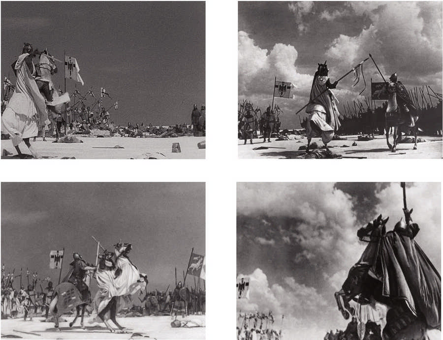 Нечто в конструкции «Александра Невского» напоминает процесс создания живописного произведения. Не только тот факт, что фильм был почти полностью нарисован, до того как был снят, и то, что он разворачивается почти как рисунок, с кадрами, в которых мало движения или ничто не движется, кроме света. Скажем, начальные кадры фильма – это пять пейзажей, в четырех из них доминируют скелеты, непогребенные жертвы давней битвы. Еще одним примером могут служить кадры перед скоком тевтонской конницы в Ледовом побоище: три дальних плана равнины, где линия горизонта прилипла к нижнему краю экрана, а в кадре преобладает небо, заполненное грозовыми облаками, подобно тому небу над Толедо, что было написано Эль Греко. В этом есть что-то от живописи, но не потому, что каждый кадр предъявляет себя зрителю, как если бы это была картина, оставаясь на экране дольше, чем необходимо для того, чтобы опознать снятых людей, объекты и пейзажи. Значение имеют не действия персонажей в каждой сцене или, по крайней мере, не только они. Значение имеет действие изображения в кадре в себе и для себя.