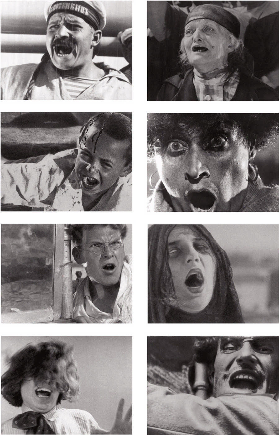 Маркируя деградацию человеческой речи к животному состоянию, визуальный мотив разверстого рта размывает границы между внутренним и внешним, давая доступ к плоти, к интимному пространству, обычно невидимому, которое Натали Роэленс обозначает как «обратная сторона лица»[17]. Эти бессознательные, регрессивные измерения делают разинутый рот энергичной, тревожащей формой эксцесса, вызывают мощное состояние привязанности. Крик как таковой не мог не привлечь внимания Эйзенштейна. В его фильмах многочисленные жертвы и невинные люди кричат в момент надругательства или уничтожения: один из самых известных примеров этого – кричащая Учительница[18] в «Потёмкине». Действенный инструмент пафоса, широко открытые рты персонажей должны пробуждать негодование зрителя, заражать его желанием в свою очередь кричать.