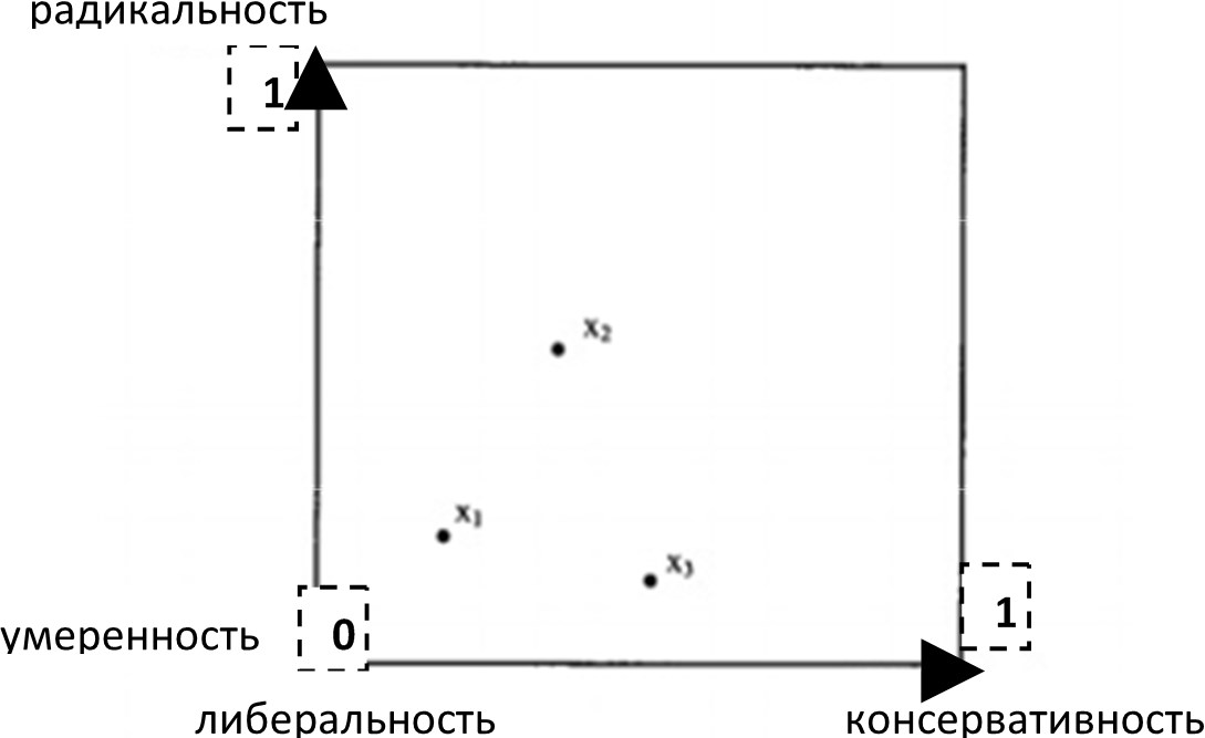 Итак, вот в чем состоит суть этих моделей. Если представить модель «political space» в декартовской системе координат (см. рис. 1), то она будет иметь на каждой оси определенные политические аспекты. Значения, отмеренные по осям, будут варьироваться от 0 до 1. Это сделано для того, чтобы избежать необходимости измерять в численном выражении все то, что оказало влияние на принятие того или иного решения: например, как измерить либеральность в любой другой системе счисления, кроме двоичной? Каждый судья (разумеется, абстрактно) ставит точку в этом очерченном пространстве, и эта точка суть его политический идеал (для судьи A – х1, судьи B – х2, судьи C – х3 ). Именно в соответствии с ним и принимаются те или иные решения85. Дело не обязательно в политике в традиционном смысле, дело в идеологиях и даже тех доктринах, в унисон с которыми судья рассуждает, с теми, которые затем использует на практике. Эта модель может быть также представлена и в одномерном пространстве, тогда х1 (политический идеал) будет находиться между, скажем, либеральностью и консервативностью, а эти критерии, в свою очередь, уже будут тяготеть к Y (yes) / N (no)86 при принятии того или иного решения. Но нет смысла сужать масштаб пространства до одномерного – очевидно, что даже рассмотрение объекта в двумерном дает совсем немного сведений. Например, по x отложена «либеральность – консервативность87», а по y – «умеренность – радикальность». Предполагается, что идеал судьи (х1) будет, к примеру, тяготеть к либерализму и умеренности. Помимо этих критериев нам выяснить ничего и не удастся – чтобы достичь этой цели, придется вводить все новые и новые оси и бесконечно увеличивать количество измерений (трехмерное, четырехмерное и т. д.), и итогом станет только чрезмерное усложнение механизма оценивания предпочтений судьи во время правоприменения при переносе основных этапов его протекания на бумагу88. Именно потому наиболее адекватно и интересно отражающей воздействие неправовых влияний на правоприменение является другая модель – «case space»89.