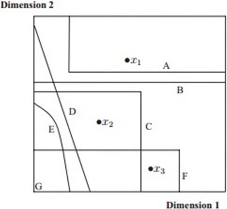 Это образец модели «case-space» в двухмерном пространстве102, ограниченном определенными пределами. Каждая точка в этом пространстве представляет собой потенциально зафиксированное дело (взамен политических представлений-идеалов в модели «politicalspace»). По оси y дело х1 – точка экзстремума-максимум и х3 – точка экстремума-минимум. По оси x х3 – точка экстремума-максимум и х2 – точка экстремума-минимум. Также дано 7 озаглавленных правил. Судебное дело решается с результатом ДА103, если оно находится в поле или ниже правила, и с результатом НЕТ104, если находится выше (значение выходит за рамки максимума, установленного правилом) области, охватываемой правилом. Тогда все 7 отображенных правил укажут на то, что по делу х1 будет принято решение НЕТ. По делу х2 будет принято решение ДА при использовании правил A, B, F. Правилом G проводится основание, границы судебных дел. Правила A, B, C, F устанавливают ограничения по каждой оси. Правила D и E соединяют обе оси. Правила C и F – связывающие звенья для достижения результата ДА; судебное дело должно лежать в тех границах, которые установлены по осям x, y. Если результат ДА – результат, соответствующий наиболее консервативным взглядам, то правило A – самое консервативное и правило G – менее консервативное среди всех иных. Но не для всех правил от B до F эта закономерность применима напрямую (например, мы можем сказать, что правило D более консервативно, чем правило E). Мало просто отразить эти дела в системе координат – для достижения практических целей нужно выявить некоторые закономерности, понять, как в подобных ситуациях судебная система функционирует. Это можно сделать графически: достаточно соединить точки в хронологической последовательности (в том порядке, в котором дела возникали и рассматривались). Полученная функция будет монотонной105 в случае, если судья неуклонно мыслил в одном и том же направлении при разрешении сходных дел на протяжении сколько-нибудь длительного отрезка времени.