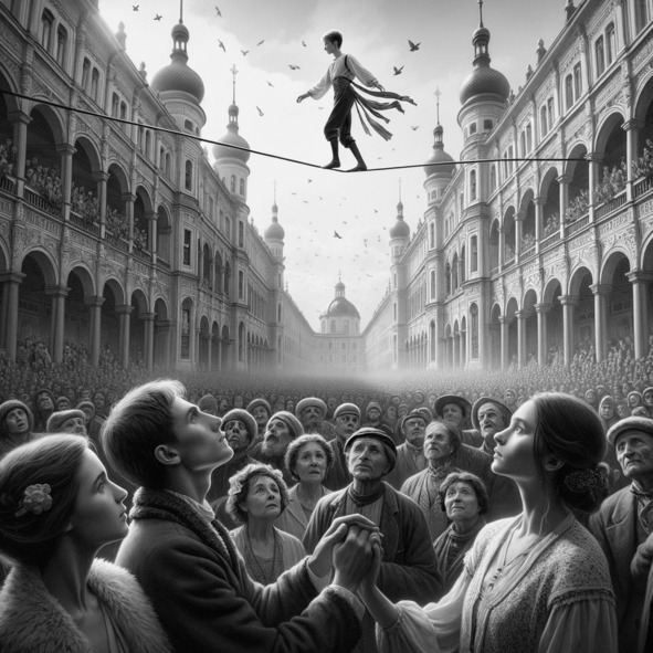 Юноша скользил по канату над площадью. Его взгляд был устремлен вперед, в будущее, но он ощущал важность каждой секунды жизни, и потому все его движения были рассчитаны. При этом он двигался с необыкновенной легкостью и без страховки. На лице была улыбка, подбадривающая зевак.