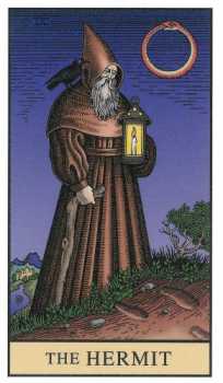 Отшельник символизирует следующую алхимическую операцию совершенствования вещества – осаждение (отделение взвесей от жидкости). На карте изображен философ, ищущий следы прошедших Путь до него. Ворон на плече означает стадию nigredo. В левой части карты (прошлое) мы видим замок, что говорит нам о том, что поиск информации в уютных залах библиотеки уже в прошлом, а сейчас искать нужно в "полевых условиях". В своей работе «О тщете искусств и наук» Агриппа Неттесгеймский высказался в следующем смысле: если кто-либо хочет что-либо уразуметь в себе самом и в мире, он должен, прежде всего, разувериться в книжном познании». В конце восемнадцатого века аналогичную мысль выразил Л.К. де Сен-Мартен.