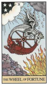 Колесо Фортуны знакомит нас с основами алхимической теории. В центре карты изображены два дракона, бескрылый и крылатый, образующие круг. Это символы серы и ртути соответственно. Согласно теории, разработанной алхимиком Джабиром ибн Хайяном в основе всех металлов лежат два «принципа» – ртуть (философская ртуть) и сера (философская сера). Ртуть является «принципом металличности», сера – «принципом горючести»4. Алхимические принципы, в свою очередь, образованы элементами-стихиями: ртуть содержит воду и воздух, а сера – землю и огонь. Символы четырех стихий мы видим по краям карты, они образуют крест созидания (в нем напротив друг друга располагаются дружественные стихии). Такое сочетание элементов в алхимии символизирует стабильность, постоянство и устойчивость.