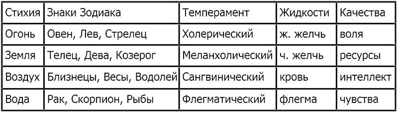 Таково, по Аристотелю, соответствие знаков Зодиака, стихий, жидкостей организма, темпераментов и четырех основных качеств.
