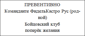Три строчки, не считая ПРЕВЕНТИВНО. Но и здесь вопрос: почему Фидель Кастро Рус я записал целиком? Плюс команданте. Да ещё с эпитетом – родной. Хм, полное имя в комплекте с воинским званием… А может, я тем самым хотел зашифровать само слово «полностью»? Но как связать Фиделя с Бойцовским клубом? А хрен его знает… Вернёмся назад, на прежнюю страничку.