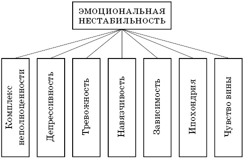 Итак, второй типологический концепт, о котором сейчас пойдет речь, может называться эмоциональностью, или тревожностью, или плохой приспособляемостью, или нестабильностью, или нейротизмом (возможны и другие термины). Данная теоретическая модель также основывается на том эмпирическом факте, что различные личностные качества коррелируют друг с другом. Из приведенной на рисунке 2 диаграммы видно, что этот личностный тип включает такие черты, как низкая самооценка, подавленность, тревожность, навязчивость, недостаток автономии, ипохондрию и чувство вины. Правда, корреляции между этими чертами личности не очень велики, но существует отчетливая тенденция, что человек, набравший высокий балл при измерении одного из этих качеств, получит столь же высокий балл и по всем другим.