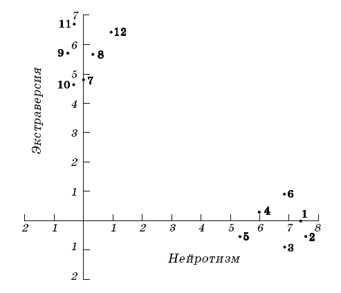 А теперь подведем итоги. Ответив «да» на любой из первых шести вопросов, вы получаете за каждый ответ один балл в пользу эмоциональности, в то время как ответ «нет» никак не оценивается. Сходным образом, каждый ответ «да» на любой из последних шести вопросов дает один балл в пользу экстравертивности. Таким образом, мы получаем две суммы баллов, каждая из которых может варьировать от 0 (очень стабильный, очень интровертивный) до 6 (очень нестабильный эмоционально, очень экстравертивный). У большинства тестируемых сумма баллов обычно равна 2, 3, максимум 4; данные значения указывают на среднюю степень эмоциональности или экстравертивности. Откуда мы знаем, что предложенные двенадцать вопросов попадают в две независимые группы и полученные там оценки могут складываться? И здесь мы вновь вынуждены воспользоваться статистическим методом подсчета корреляций. Выяснилось, что первые шесть вопросов, равно как и последние шесть, тесно коррелируют между собой, тогда как между двумя этими группами по шесть вопросов корреляция полностью отсутствует. Данная ситуация наглядно представлена на рисунке 3, где графически отображены корреляции между всеми двенадцатью вопросами. Угол в девяносто градусов указывает на полное отсутствие корреляции, а угол в ноль градусов свидетельствует о идеальном совпадении. Видно, что две группы точек по шесть каждая расположены под прямым углом друг к другу, демонстрируя отсутствие корреляции между этими группами. В то же время шесть вопросов, которые составляют каждую из групп, располагаются на диаграмме очень кучно, что опять-таки наглядно демонстрирует очень высокую корреляцию вопросов внутри каждой группы. Таким образом, нет ничего субъективного в нашем делении вопросов на две разных группы; основанием для такой группировки явились объективные данные о кластеризации ответов, полученных на-репрезентативных выборках населения.