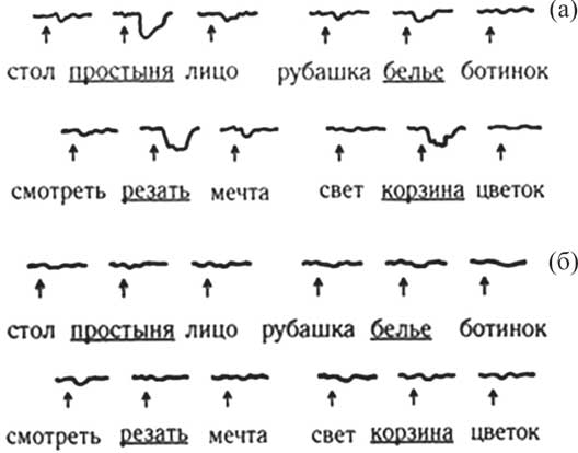 Кожно-гальванический рефлекс виновного человека: «виновные» слова подчеркнуты; стрелки указывают, когда было произнесено стимулирующее слово (а). Кожно-гальванический рефлекс невиновного человека: «виновные» слова подчеркнуты (б)