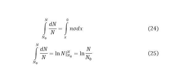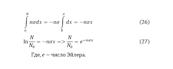 Получая такое выражение, можно проинтегрировать обе части, указав, что количество частиц, как известно – функция, которая по определённому интегралу будет брать в себе границы от изначального количества направленных частиц к количеству взаимодействий в мишени для первого интеграла. Для второй же стороны этот определённый интеграл имеет границы от нуля до значения крайней толщины мишени (24—25) [].