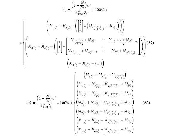 Из этого соотношения можно получить уравнение, которое бы описывало количество частиц входящих во взаимодействие (28) и откуда можно было бы вычислить процентную эффективность ядерной реакции (29).