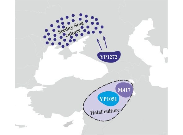 В середине VI-го тысячелетия до н.э. носители субклада R1a-YP1272 переходят через Кавказские горы и мигрируют далее в Северное Причерноморье, где в середине V-го тысячелетия до н.э. возникает среднестоговская культура. Носители субкладов R1a-M417 и R1a-YP1051 мигрировали с территории хассунской культуры далее на север на территорию халафской культуры, основным населением которой были носители y-гаплогрупп G2 и G1 (рис.12).