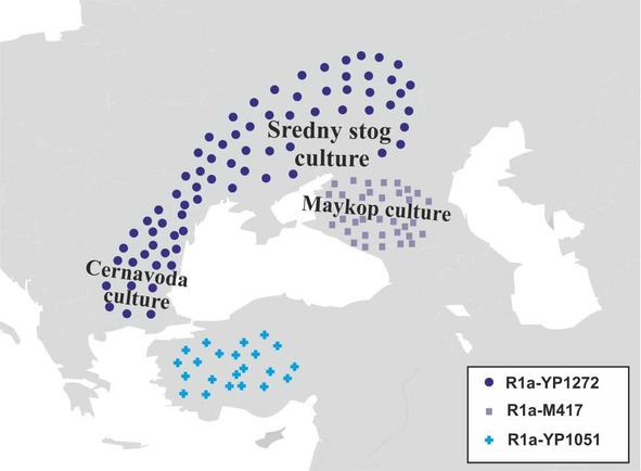 Рис.14 Географическая локализация носителей субкладов R1a-YP1272, R1a-YP1051 и R1a-M417 во второй половине IV-го тыс. до н.э.