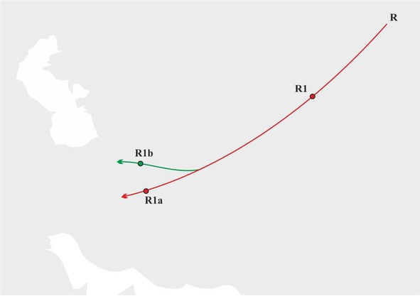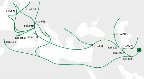 Таким же образом можно восстановить маршруты миграции наших более отдаленных предков. Например, предки большей части мужского населения сегодняшней Европы (носители y-гаплогрупп R1a и R1b) пришли на территорию Европы из Азии. Y-гаплогруппа R возникла где-то на территории Сибири примерно 30 тысяч лет назад. Исследования человеческих останков, найденных на позднепалеолитической стоянке в Сибири у нынешнего села Мальта Усольского района Иркутской области [4], показали, что останки принадлежали носителю y-гаплогруппы R. Y-гаплогруппа R1, вероятно, возникла так же на территории Сибири примерно 27 500 лет назад. С началом ледникового периода одна из групп носителей y-гаплогруппы R1 мигрировал из Сибири в Среднюю Азию, где примерно 22 000 лет назад произошло разделение на y-гаплогруппы R1a и R1b. Далее носители y-гаплогрупп R1a и R1b продолжили миграцию в юго-западном направлении на территорию Иранского нагорья (рис.4).