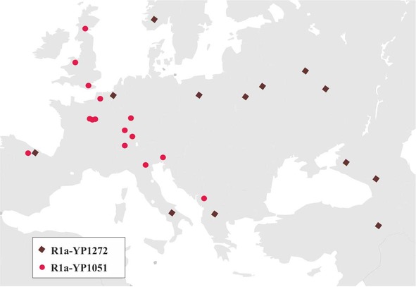 Для определения основных маршрутов миграций носителей y-гаплогруппы R1a с территории Иранского нагорья в Европу необходимо проанализировать распределение основных субкладов данной y-гаплогруппы. Таких субкладов всего три: R1a-YP1272 – возник примерно 14300 лет назад, R1a-YP1051- возник примерно 8500 лет назад и R1a-M417 – возник примерно 8500 лет назад. Несмотря на то, что носителей субкладов R1a-YP1272 и R1a-YP1051 [2] (рис.5) найдено не так уж и много, тем не менее картина распределения выявленных при тестировании носителей данных субкладов дает возможность определить маршруты миграций всех трех основных субкладов y-гаплогруппы R1a.