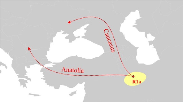Анализ распределения носителей субкладов R1a-YP1272 и R1a-YP1051 на территории Европы дает основания предположить, что миграция носителей y-гаплогруппы R1a на территорию Европы проходила двумя основными маршрутами: первый маршрут – через территорию Анатолии на Балканский полуостров, а второй – через Кавказские горы между Черным и Каспийским морями (рис.6).