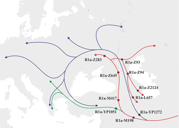 Учитывая данные о распределении носителей субкладов, лежащих ниже снипа R1a-M417 (снипы R1a-Z283 (xZ282) и R1a-Z93 (xZ94)), носители субклада R1a-M417, очевидно, мигрировали на территорию Европы по тому же маршруту, что и носители субклада R1a-YP1272, т.е. через Кавказские горы. На основании этой информации можно достаточно точно реконструировать основные маршруты и этапы миграции носителей y-гаплогруппы R1a на территорию Европы: