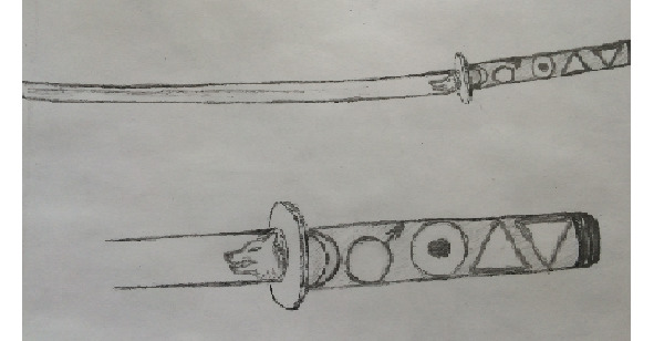 Он увидел перед собой меч своего отца, о котором мечтал всю свою жизнь. Это был слегка изогнутый меч с односторонним клинком, излучающий магическую силу. Он был не похож на типичные европейские мечи, скорее – восточный. На рукоятке были знаки: серебра или Луны (в виде полумесяца), железа или Марса (в виде круга со стрелкой, указывающая на северо-восток), золота или Солнца (в виде круга с жирной точкой посередине), огня (в виде правильного треугольника с одним углом вверху) и воды (в виде правильного треугольника с одним углом внизу). Лезвие от рукояти начиналось с серебреной головы волка, показывая тем самым жажду крови. Как только Алан взял его в свои руки, меч слегка засверкал. Все в комнате удивились, как по-особенному заблестел этот необычный меч. В этот момент Алан почувствовал единство с этим мечом, и он хорошо его чувствовал, будто меч был живым и скучал по нему долгое время.