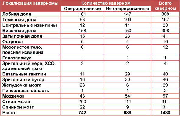 Табл. I. Распределение кавернозных мальформаций по локализации у 1272 больных, 1993—2011 гг.*