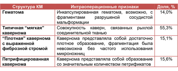На другом полюсе находятся «плотные» каверномы, состоящие преимущественно из тромбированных полостей и соединительной ткани. В некоторых из них можно обнаружить обызвествленные участки. Между этими крайними типами существует большое число различных вариантов. Эти особенности каверном хорошо определяются в ходе хирургического вмешательства, что позволило нам проанализировать частоту различных вариантов КМ при удалении мальформаций супратенториальной локализации (табл. III).