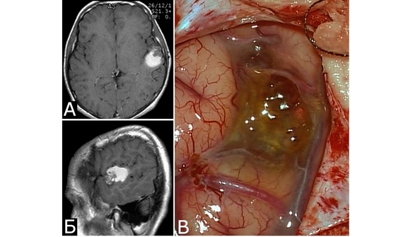 Рис. 8. Б-ной И-юн, 13 лет. Кавернозная мальформация и гематома оперкулярной зоны слева. Повторные кровоизлияния. А, Б – МРТ, режим Т1, аксиальная и сагиттальная проекции. 4-е сутки после 2-го кровоизлияния. Видна ткань КМ в виде гетерогенного сигнала, и гематома в виде гиперинтенсивного сигнала, расположенная кзади от КМ. В – интраоперационное фото после вскрытия ТМО, 2 месяца после 2-го кровоизлияния. Виднаи желтая окраска окружающих тканей и отдельные каверны, выходящие на поверхность мозга