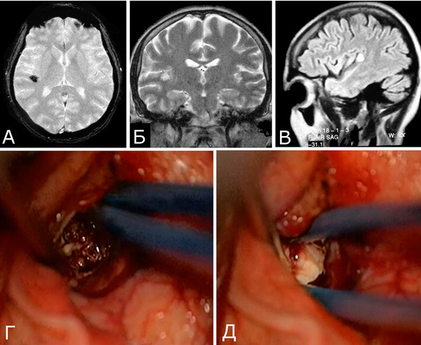 Рис. 9. Б-ная М-на, 39 лет. Небольшая КМ в глубинных отделах задней верхней височной извилины справа. Клиническое течение: Редкие эпилептические припадки в течение 3-х лет. А, Б, В – КМ диаметром 1см, без явных признаков кровоизлияний (МРТ, режимы GRE, Т2, Flair, аксиальная, фронтальная, сагиттальная проекции). Г, Д – интраоперационные фото. В ходе операции нет визуальных признаков изменения мозговой ткани вокруг каверномы, мозг после удаления КМ имеет нормальную окраску
