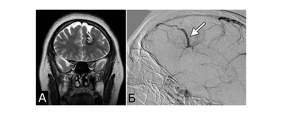 Сочетание каверномы с АВМ выявлено у двух больных, причем в обоих случаях клинические проявления заболевания были обусловлены АВМ, а кавернома явилась случайной находкой (рис. 1).