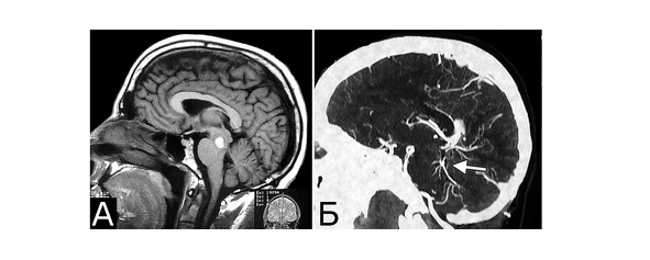 Рис. 10.II. Сочетание кавернозной и венозной мальформаций. КМ среднего мозга (А – МРТ, режим Т1). Венозная ангиома ствола. Аномалия венозной системы мозга в виде отсутствия прямого синуса (Б – СКТ-АГ. Стрелкой указана венозная ангиома). Клиническое течение: однократное кровоизлияние в ствол с развитием частично обратимой очаговой симптоматики. Острый тромбоз вен нижних конечностей и тромбэмболии ветвей легочной артерии (б-ной Ш-ов, 48 лет)