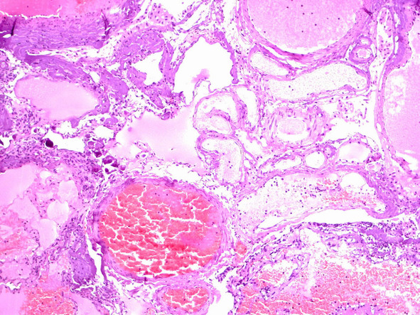 Рис. 11. Кавернозная мальформация «классического» типа — конгломерат сосудистых полостей различной формы и размеров, выполненных кровью. Ув. х 100