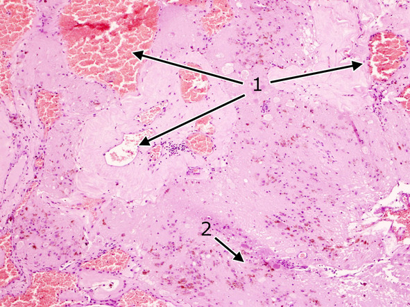 Рис. 12. Отшнуровавшиеся сосудистые полости (1) в ткани мозга с отложениями гемосидерина, гиперплазией глии (2). Ув. х 400