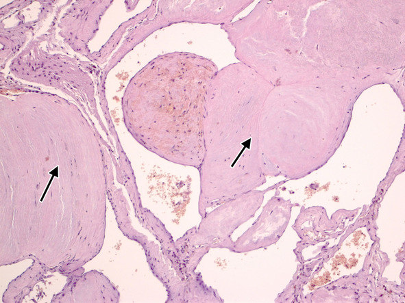 При рутинном исследовании в световом микроскопе (срезы толщиной 5 мкм, окраска гематоксилином и эозином, при необходимости – докрашивание по Ван-Гизон и Маллори) каверномы представляют собой конгломерат тонкостенных полостей разнообразной неправильной формы, выстланных эндотелием и разделенных соединительнотканными перегородками. Соединительная ткань перегородок может быть представлена как тонкими коллагеновыми волокнами, так и грубоволокнистой фиброзной тканью с различной степенью дистрофических изменений. Характерным признаком является отсутствие в стенах каверн гладкомышечных клеток и эластических волокон, а также мозговой ткани между кавернами (рис. 11) (2, 236, 299, 333).