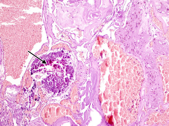 Рис. 14. Кальцификат (стрелка) и склеротические изменения в стенках сосудистых полостей. Ув. х 100