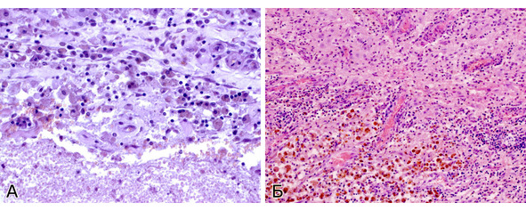 Рис. 15. А. Начальная стадия формирования стенки гематомы – скопления макрофагов, нагруженных гемосидерином. Ув. х 400. Б. Сформировавшаяся капсула гематомыс отложениями гемосидерина, лимфоплазмоцитарной инфильтрацией и новообразованными сосудами. Ув. х 200