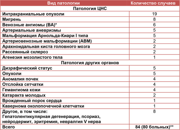 Сочетание кавернозных мальформаций с другой патологией ЦНС, а также с патологией других органов и систем установлено у 80 больных, что составило около 8% всех больных с каверномами. В эту группу не включали такие широко распространенные заболевания, как гипертоническая болезнь, атеросклероз, ИБС, сахарный диабет. Выявленные заболевания суммированы в табл. II.