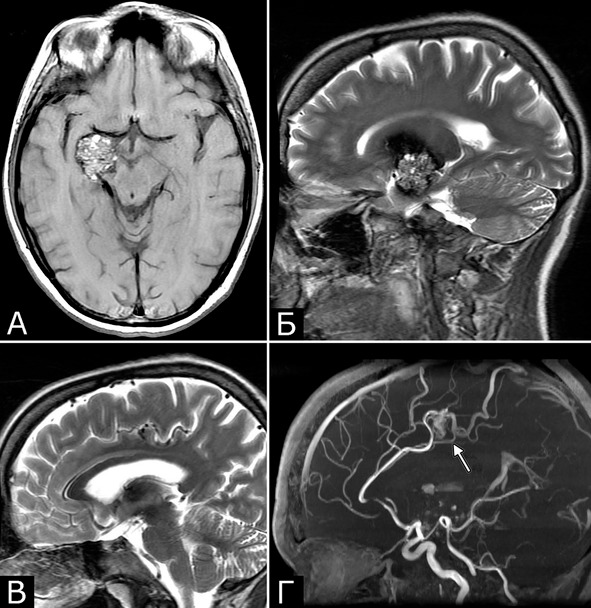 Рис. 1. Б-ная Г., 27 лет. Сочетанная сосудистая патология мозга: КМ передне-медиальных отделов височной доли справа (А – МРТ, режим Т1; Б – МРТ, режим Т2); АВМ медиальных отделов лобно-теменной области справа (В – МРТ, режим Т2; Г – МРТ-АГ). Клиническое течение: редкие вторично-генерализованные судорожные эпилептические припадки, начинающиеся с судорог в левых конечностях