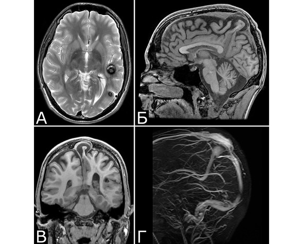 Рис. 2. Б-ной П, 22 г. Сочетанная сосудистая патология мозга: Множественные КМ головного мозга. Аномалия развития венозной системы мозга. А – КМ височной, теменной и затылочной долей слева (МРТ, режим Т2, аксиальная проекция). Б, В – аномалия развития костей и оболочек мозга в виде локальной деформации внутренней костной пластинки и губчатого вещества теменных костей в области впадения патологической вены в ВСС. Расщепление аномального ВСС на две лакуны, пролабирование мозга в область дефекта (МРТ, режим Т1, сагиттальная и фронтальная проекции). Г – аномалия венозной системы в виде отсутствия прямого синуса, формирования крупной патологической вены, впадающей в заднюю треть ВСС (МРТ-АГ, сагиттальная проекция)
