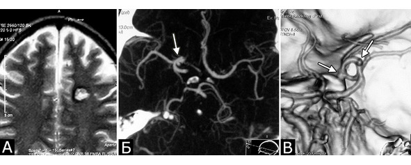 Рис. 3. Б-ной К-ов, 37 лет. Сочетанная сосудистая патология мозга: КМ глубинных отделов лобной доли слева (А – МРТ, режим Т2); две аневризмы ВСА справа (Б, В – СКТ-АГ, аневризмы указаны стрелками). Течение болезни: за 6 месяцев до поступления перенес два генерализованных судорожных припадка. При МРТ выявлена КМ лобной доли слева, которая послужила причиной припадков. При СКТ-АГ выявлены две аневризмы ВСА справа (случайная находка). Лечение: 1-ая операция – клипирование двух аневризм ВСА справа. 2-ая операция – удаление каверномы левой лобной доли