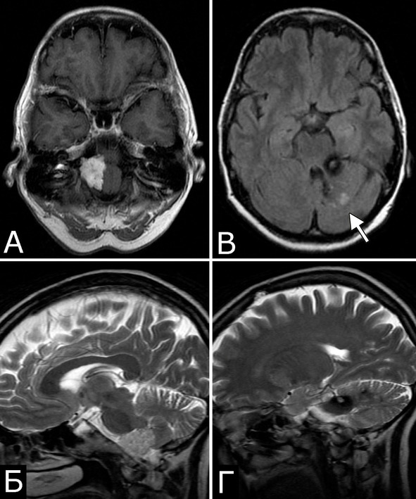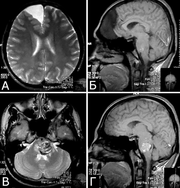 Рис. 5. Б-ной Е-ов, 30 лет. Сочетанная патология мозга: Большая арахноидальная киста правой лобной области, неуточненной этиологии (А, Б – МРТ, режимы Т2 и Т1, аксиальная и сагиттальная проекции). Крупная КМ ствола мозга на уровне средней и нижней трети варолиева моста, больше слева (В, Г – МРТ, режимы Т2 и Т1, аксиальная и сагиттальная проекции). Клиническое течение: острое развитие левостороннего гемипареза с последующим частичным регрессом