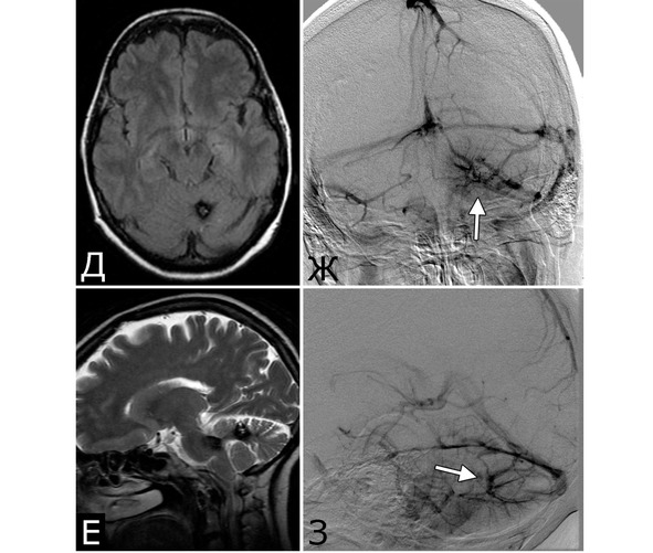 1. Опухоль (менингиома) мосто-мозжечкового угла справа (А – МРТ с введением КВ, режим Т1, аксиальная проекция, Б – МРТ, режим Т2, сагиттальная проекция); 2. КМ верхнее-медиальных отделов левой гемисферы мозжечка (В, Д – МРТ, режим Т1, аксиальная проекция, Г, Е – МРТ, режим Т2, сагиттальная проекция. Стрелкой указана дополнительная тень гиперинтенсивного сигнала – косвенный признак венозной ангиомы). 3. Венозная ангиома (стрелки) левой гемисферы мозжечка (Ж, З – прямая АГ, венозная фаза). Клиническое течение: в течение нескольких лет – сильные стреляющие и ноющие боли в левой половине лица и головы