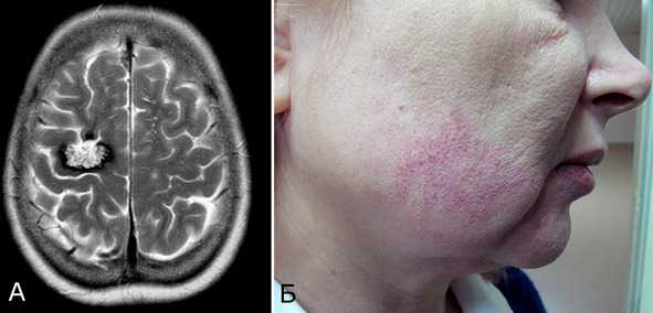 Рис. 6. Б-ная М-ич, 62 г. Сочетание кавернозной мальформации правой лобной доли (А – МРТ, режим Т1, аксиальная проекция) и ангиомы кожи щеки (Б)