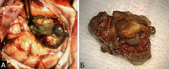 Рис. 7. Вид каверномы на операции в процессе выделения (А) и после удаления единым блоком (Б)