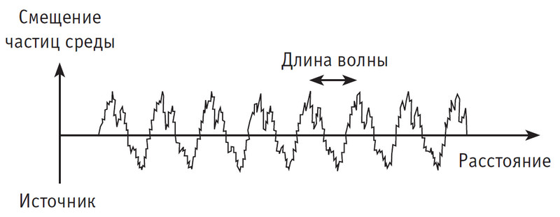 Если движения источника звука периодические, то такими же будут и движения частиц среды, причём частицы, находящиеся на определённом расстоянии друг от друга (в направлении распространения волны), будут совершать синхронные движения. Такое минимальное расстояние называется длиной волны. Если в какой-то момент времени мы сделаем «мгновенную фотографию» распределения смещений частиц от своих равновесных положений, то увидим повторяющуюся картину (рис. 1).