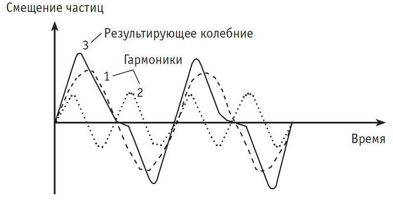 Оказывается, любое периодическое движение чисто математически может быть представлено как сумма гармонических колебаний с кратными частотами, то есть с частотами, полученными умножением некоторой основной частоты f0 на целые числа: 2, 3, 4… (это известная математикам теорема Фурье). Наименьшая частота этого ряда (f0) называется основной, а колебание с этой частотой – основным колебанием или первой гармоникой. Основная частота определяется периодом исходного движения. Колебания с кратными частотами 2f0, 3f0, 4f0… называют гармоническими обертонами или просто гармониками (второй, третьей, четвёртой и так далее до бесконечности). Многообразие сочетаний различных амплитуд (и фаз) гармоник обеспечивает все возможные формы результирующего колебания.