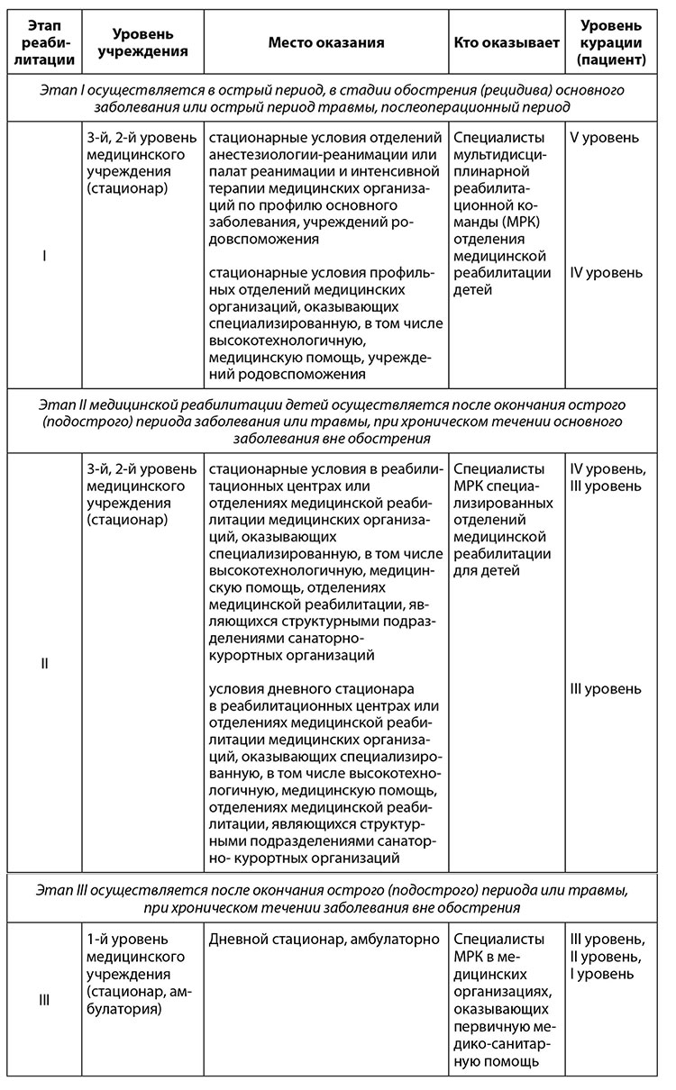 Медицинская реабилитация проводится этапно с учетом уровня курации и уровня медицинского учреждения (табл. 1).