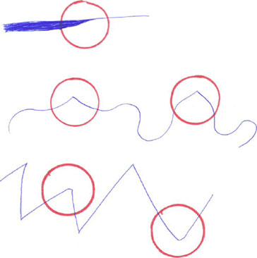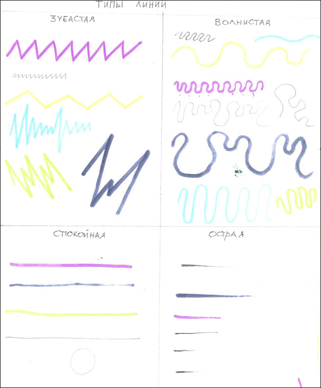 Этапы1. Нарисовать собственную таблицу типов линий с аналога: линии могут быть произвольной, не повторяющей табличную формы. Обязательно выполнение тремя типами материалов разной степени жесткости: фломастером, карандашом НВ и шариковой ручкой. Необходимо проследить, чтобы у ломаных линий не было скруглений, у волнистых – углов, а острые обладали плавностью перехода.