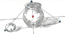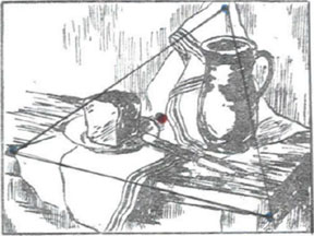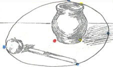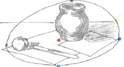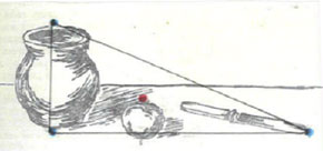 Добавив нож и разбив тем самым монотонную линию низа композиции, удалось вписать предметы в приблизительный овал, но при этом образовались две разобщенные группы: яблоко с ножом и горшок с тенью, никак не связанные между собой.