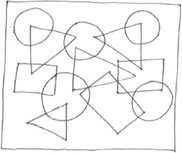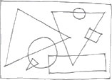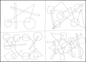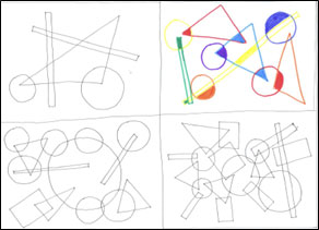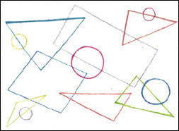 Вписать в каждую из полученных («заданных») рамок свою композицию из того же набора геометрических фигур, добиваясь их гармоничности. Если изначально работы получались удачными, то можно ограничиться тремя рисунками.
